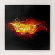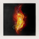 Pena de pavão brilhante feita de fogo e chamas sobre fundo negro.