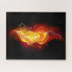 Pena de pavão brilhante feita de fogo e chamas sobre fundo negro.