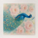 Uma ilustração aquosa de um pavão orgulhoso rodeado por pedras de cor pastel.