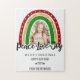 Modelo de foto de Natal moderno com um arco-íris acima da sua própria imagem. O arco-íris colorido consiste em três estilhaços: vermelho com estrelas ouros, folha de ouro e verde com flocos de neve. As palavras "paz, amor, alegria" são exibidas em letras de caligrafia de tendências.