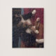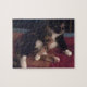 Nesta Quebra-cabeça de Jigsera, as patas de gatinho macio são a primeira coisa que você vê nesta fotografia original de ZoeSPEAK de um gato calico. A gata preta e marrom está deitada sobre um cobertor vermelho-escuro e marrom sobre um fundo escuro, e suas patas brancas se destacam, espalhadas na sua frente com o centro dois cruzados um sobre o outro. O pelo branco em seu peito leva até seu rosto, com os olhos fixados em algo do outro lado da sala.