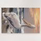 Foto de um pelicano parado na praia ao pôr do sol, com as ondas do oceano caindo à distância. Essa bela quebra-cabeça é um desafio a ser completado. Seria lindo em uma armação na sua parede.