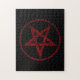 Pentagrama vermelho, invertido, texturizado em círculo, sobre fundo preto. Símbolo oculto. 666