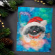 Pequinês Raça Cachorro Natal apresenta uma aquarela de um Pequinês com um chapéu vermelho de Papai Noel, uma coleira de Natal vermelha e uma aquarela de galáxia.