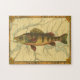 Esta impressão ilustra um quadro artístico de um peixe-perca amarelo. O plano de fundo exibe um mapa geográfico antigo em cores bege claro. A estrutura marrom se assemelha a um padrão antigo de madeira com flores amarelas-vermelhas nas bordas. Um excelente extra para a sua coleção de pesca!
