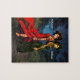 This puzzle features a vibrant anime-style illustration of two young women with extensive tattoos, set against a solid bright yellow background. The woman on the left, labeled "Autumn," wears a flowing red high-low dress and black heels, with her dark hair tied up and a small red horn accessory. The woman on the right, labeled "Willow," wears a dark blue gown with a high slit and her dark hair down. Both have detailed arm and leg tattoos. The image is printed on a durable square material, attached to a standard metal split ring and chain for easy attachment to keys or bags.