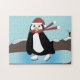 Um adorável cachecol xadrez vestindo pinguim desfruta de um dia de inverno com algum gelo patinando em um quebra-cabeça