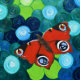 Pintura acrílica de uma borboleta Peacock sobre um abstrato, fundo floral.