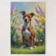Um cão alegre senta-se pacificamente sobre a relva verde-luxuosa, rodeado por primavera coloridas floridas sob um céu azul macio. Esta pintura digital de óleo captura um momento sereno com pinceladas expressivas, cores quentes e um senso de alegria gentil.