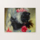 Quebra-cabeça com um gatinho preto e branco! Esse tuxedo fofo se posou entre as flores vermelhas num cobertor azul. Um presente magnífico para amantes de gatos e entusiastas de arte vitorianos!
