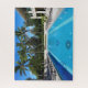 Quebra-cabeça de serra. Uma piscina de natação pristina com padrões decorativos no fundo é rodeada por cadeiras de salão e palmeiras. O céu azul claro e o verde exuberante criam uma atmosfera tropical relaxante.