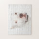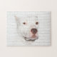 Imagem de pitbull branco Terrier em um fundo de tijolo pintado branco para problemas adicionais de amantes de cachorros quebra-cabeça de quebra-cabeça