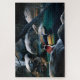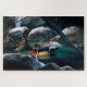 Dois patos de madeira num lago na floresta. Árvores e rochas ao redor do lago enquanto os patos-de-madeira machos e fêmeas desfrutam do lago
