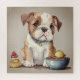 This puzzle is a cute baby Bulldog who is in deep thought about something. The Bulldog is in a bit of cartoon art and is sitting by the food with a ball dropped into the bowl he would rather be playing than having to eat. It is a adorable science to put together and will make a cute gift idea