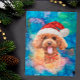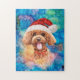 Poodle Breed Dog O Natal apresenta uma aquarela de Poodle com um Chapéu Papai noel vermelho, uma coleira vermelha de Natal e uma galáxia aquática.