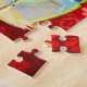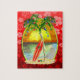 Boas festas dos Sandy Beach mornos de sua praia tropical favorita da ilha. Palmeira decorada com enfeites de natal e luzes, com uma prancha retro que inclina contra a árvore de Natal na parte dianteira um por do sol sobre o oceano. O fundo vermelho da cor do feriado de tartarugas e do hibiscus havaianos de mar de Honu floresce.
