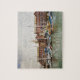 O porto de Portsmouth, Reino Unido. As construções vermelhas do dockyard naval com a torre da capela no fundo produzem um fundo para os barcos coloridos amarrados acima no porto. Esta é uma reprodução de uma pintura original da aguarela.