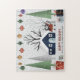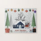 Árvores e guaxinim Feliz Natal quebra-cabeça que apresenta um guaxinim em roupas de inverno, uma casa, árvores, presentes e ornamentos.