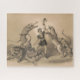 Impressão de colheita de um artista circo macho que está entre um leão, um tigre, dois lobos e um leopardo; ele está segurando um grande pedaço de carne com sua mão esquerda, por volta de 1872