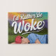 A IA gerou arte de uma pessoa dormindo na grama em frente a montanhas com um arco-íris no fundo vestindo um boné vermelho e a citação dizendo que eu Preferencialmente Ser Woke