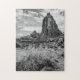 Foto preta e branca de uma formação de rocha vertical no sudoeste americano; com uma escova de esfregão em primeiro plano.