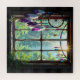 Boho puzzle. A rustic window with a purple feathered dreamcatcher hanging in the window along with colorful sparkly crystals. The window overlooks a beautiful array of trees and sunbeams shining through.