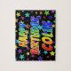 Este design de quebra-cabeça de jipsserra divertida, vibrante e com tema de aniversário exibe a mensagem "HAPPY BIRTHDAY, COLIN" com os personagens que têm um espectro colorido de arco-íris inspirado em um padrão de gradação, junto com um incrível padrão de fundo de campo estelar. Um quebra-cabeça vibrante como este pode ser uma maneira divertida de reconhecer o aniversário de alguém chamado Colin. [~Z0000468]