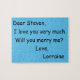 Aqui está uma maneira divertida de propor: Pegue estas peças de quebra-cabeça e coloque-as em uma bolsa. Esconda a caixa e todos os papéis que vêm com o quebra-cabeça. Apresente o saco à pessoa que você quer casado e peça a essa pessoa para colocar o quebra-cabeça. Não dê informações sobre a mensagem. Cuidado com a pessoa que você adora juntar o quebra-cabeça e depois (espero) espreitar com prazer!! Divertido e romântico, esta quebra-cabeça permite-vos propor o casamento de uma forma leve e interessante. Escolha entre uma grande variedade de cores e estilos de letras. Você não quer se casar? Está bem. Altere a mensagem. Divirta-se! Personalizável. Por Sharon Lee Hudson.
