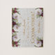 Existem peônias vermelhas burgundy e brancas na borda superior e nos cantos inferiores. O fundo é mármore branco, o texto é dourado. A primeira e a última linhas, com os nomes, são escritas em uma fonte caligráfica elegante, a mensagem "Você quer ser minha Madrinha?" está em maiúsculas.
