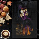Feiticeira loira sentada numa abóbora laranja grande. Do seu lado está uma gata negra numa pilha de livros. Por trás está uma floresta e um castelo