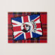 Engraçado colagem de pássaros guineafowl vestindo um penteado mohican mowhawk com um texto de anarquia com uma jack vermelha branca e azul de sindicato britânico e um fundo real de Tartan escocês Stewart. Para os produtos de pintadas correspondentes e personagens animais mais divertidos, visite o VINTAGEPRINTSORE.
