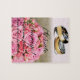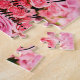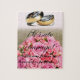 Puzzle de propuesta de matrimonio, con el texto "¡Cásate conmigo! (Seremos felices y comeremos perdices...)" con ramo de rosas de color rosa y alianzas sobre fondo tono pastel. Una sorpresa inolvidable!