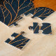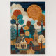 Discover the intricate beauty of this quilted folk art village. This digital illustration mimics the cozy texture of patchwork fabric and ceramic mosaics, featuring a whimsical town nestled under a giant, ornate sun. The stylized trees and cottages are rendered with detailed patterns—resembling embroidery stitches and woven textiles—in a rich palette of teal, rust orange, and cream. A perfect statement piece for boho living rooms, craft rooms, or as a challenging and beautiful jigsaw puzzle.