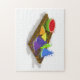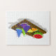 Dispõe-se de um conjunto vibrante de fatias de melancia do arco-íris num conselho de madeira que apresenta formas triangulares e redondas coloridas. As cores contrastantes em relação ao fundo neutro criam uma exibição animada e atraente.