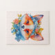 Um quebra-cabeça com uma ilustração de um retrato adorável de raposa com uma coroa e coleira florais azul e laranja.
