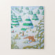 Quebra-cabeça raposa e coelhos bonitos tocando cena de neve