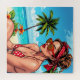 Bela pop de praia, quebra-cabeça de verão. Um desenho animado do estilo dos quadrinhos ilustra uma mulher em um biquíni vermelho de bolinhas, bandana e óculos de sol.