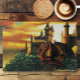 Um dragão vermelho fantasma guardando um castelo no pôr do sol.