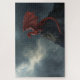 Crashing wind effects and dramatic lighting contrast the dragon’s vibrant crimson tones against dark blue and gray storm skies, enhancing depth and visual intensity. This jigsaw puzzle provides a satisfying challenge for fantasy lovers, dragon art collectors, and fans of mythical creature designs.