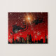 Papai Noel com seu vôo da rena em um trenó sobre a cidade. Céu nocturno e flocos de neve vermelhos. frontiernow.com