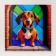 Um beagle alegre senta-se num degrau de pedra, enquadrado por uma vibrante janela de vitral. Cores ousadas e formas geométricas criam uma cena artística e divertida, ideal para temas de animais de estimação, arte ou decoração de casa.