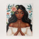 Quebra-cabeça apresenta uma ilustração espiritual floral de uma linda mulher negra com cabelo comprido, olhos fechados e palmas prensadas juntas numa posição de oração. A beleza de pele castanha parece serena enquanto ela reza, e ela é enquadrada por uma variedade de flores e folhas. Ela veste um vestido de camponês. cottagecore feminina, trabalho de arte botânica da espiritualidade estética.