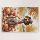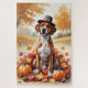 Uma pintura em forma de aquarela de um cão alegre sentado em meio a uma pilha de folhas vibrantes de queda, cercado por pequenas abóboras e bolotas espalhadas. O cachorro veste um chapéu de peregrino e fede de alegria, capturando o espírito da Ação de Graças. No fundo, campos de colheita suaves e árvores abrigadas em ouro criam um ambiente rural pacífico. Texturas gentis e tons de outono aquecidos dão à cena uma sensação acolhedora e nostálgica de celebrar a beleza da estação.