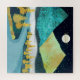 Uma bela paisagem com texturas únicas mostrando um rio e uma paisagem de montanha com lua ascensão e céu estrelado em tons de azul, ouro, verde escuro e amarelo.