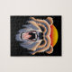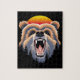 Urso-grizzly em frente a um pôr do sol com floresta ao fundo. Quebra-cabeça de serra para amantes de ursos e fãs da vida selvagem.