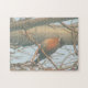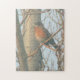 Ladrão assado vermelho sentado no galho com tronco de árvore em segundo plano. Outros ramos se destacam contra um céu azul.