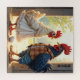Um galo e galinha vestidos de roupas humanas ficam diante um do outro com um ovo entre eles, dentro com filtro de luz solar