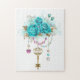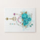 Chave de ouro antiga com rosas de turquesa de tendência, decoradas com folhas de ouro branco e miçangas cor-de-rosa e azuis. Cor agradável. Rosas de turquesa. Ouro branco. Tifania azul.
