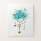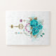 Chave de ouro antiga com rosas de turquesa de tendência, decoradas com folhas de ouro branco e miçangas cor-de-rosa e azuis. Cor agradável. Rosas de turquesa. Ouro branco. Tifania azul.