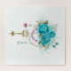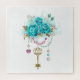 Chave de ouro antiga com rosas de turquesa de tendência, decoradas com folhas de ouro branco e miçangas cor-de-rosa e azuis. Cor agradável. Rosas de turquesa. Ouro branco. Tifania azul.